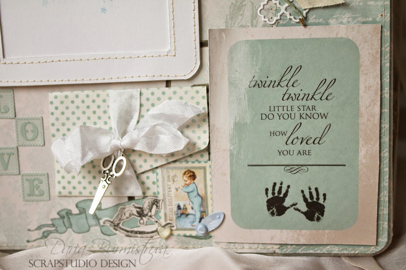 Всем привет! Последние 2 недели я жила в режиме контраста-делала параллельно и стимпанк-альбом и этот нежный,воздушный Шебби для малыша. Ну а что-зато не устаешь) Первый раз работала с новой детской коллекцией Кайзера-она мне понравилась даже больше старой!
